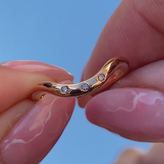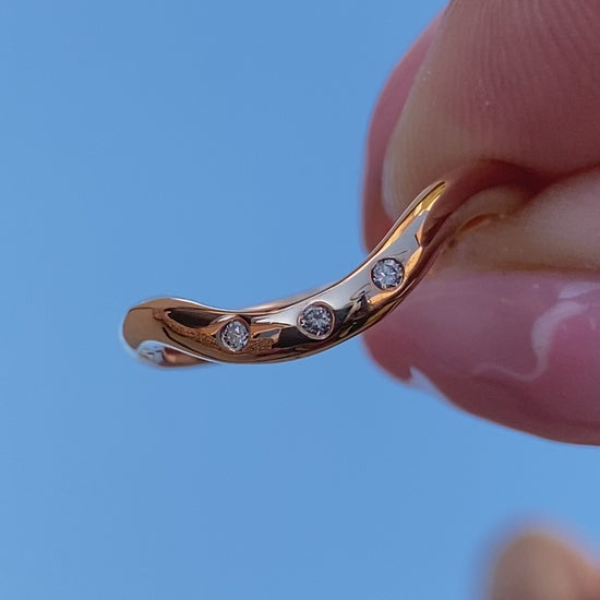 Wedding band 18ct rose gold court shaped curved band with 3 1.5mm band with flush set brilliant cut grey diamonds. Weight 2.9g