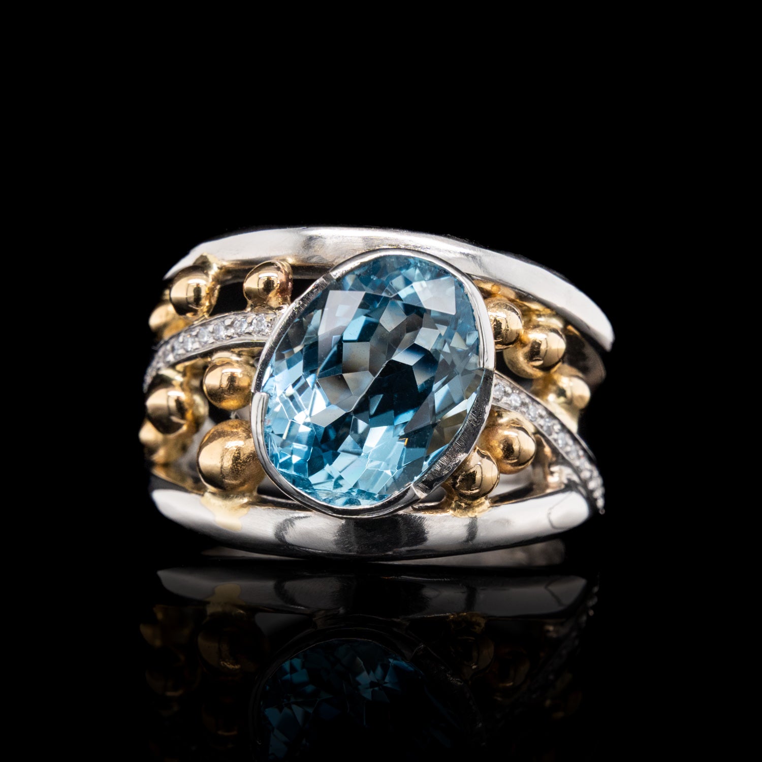 Striking triple-band platinum ring featuring a 3.36ct African aquamarine, accented by 18ct yellow gold bubbles. Grain-set diamonds add subtle sparkle along the sides, creating a sculptural, contemporary design that is both bold and elegant. Handmade in our onsite Southsea workshop.