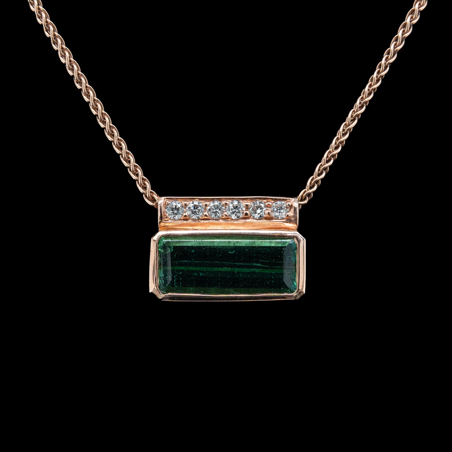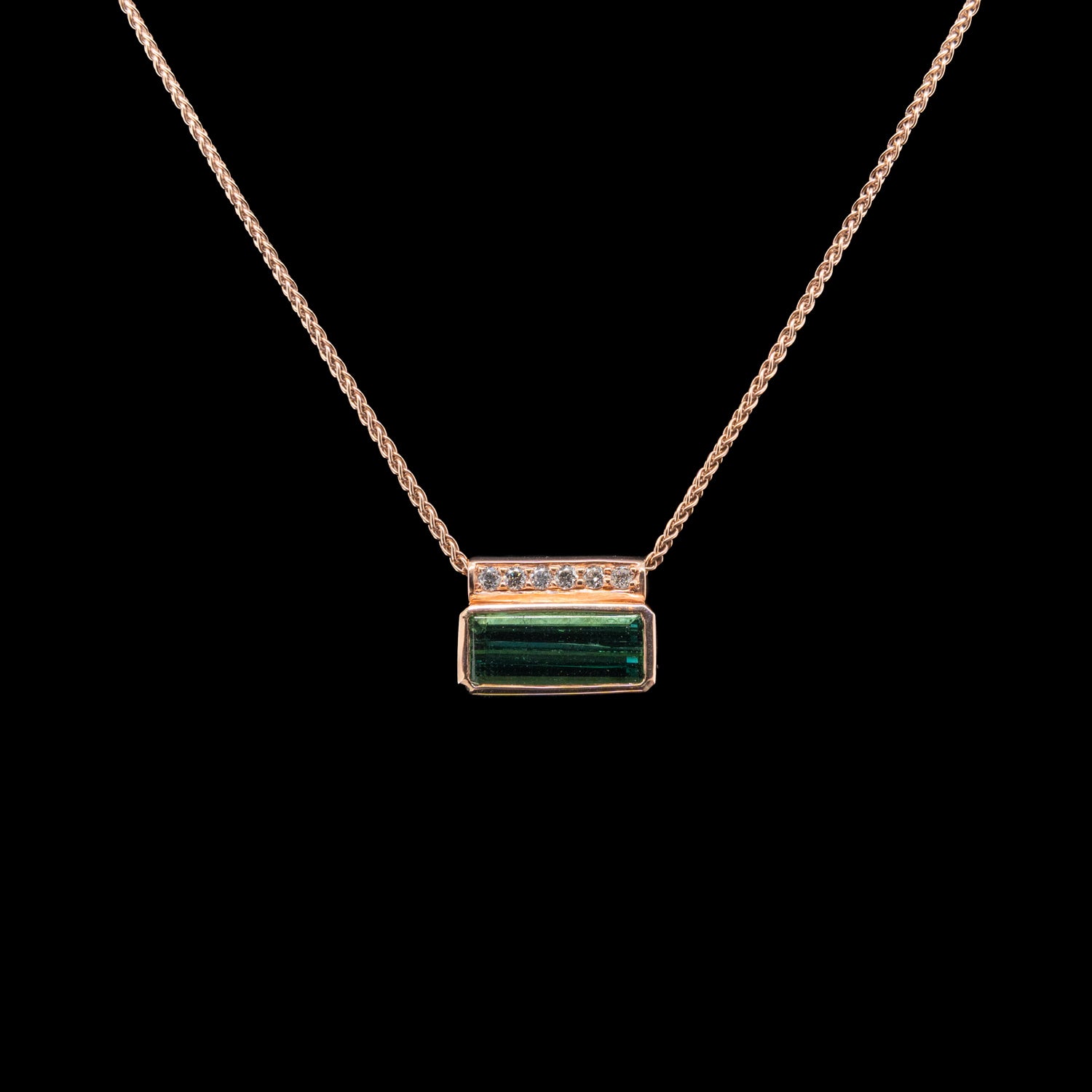 This elegant pendant centres on a beautifully proportioned green tourmaline, rubover set in warm 9ct rose gold. Subtle grain-set diamonds along the pendant tube add a refined sparkle, complementing the rich tones of the gemstone. Suspended 9ct rose gold spiga chain. Handmade in our onsite Southsea workshop