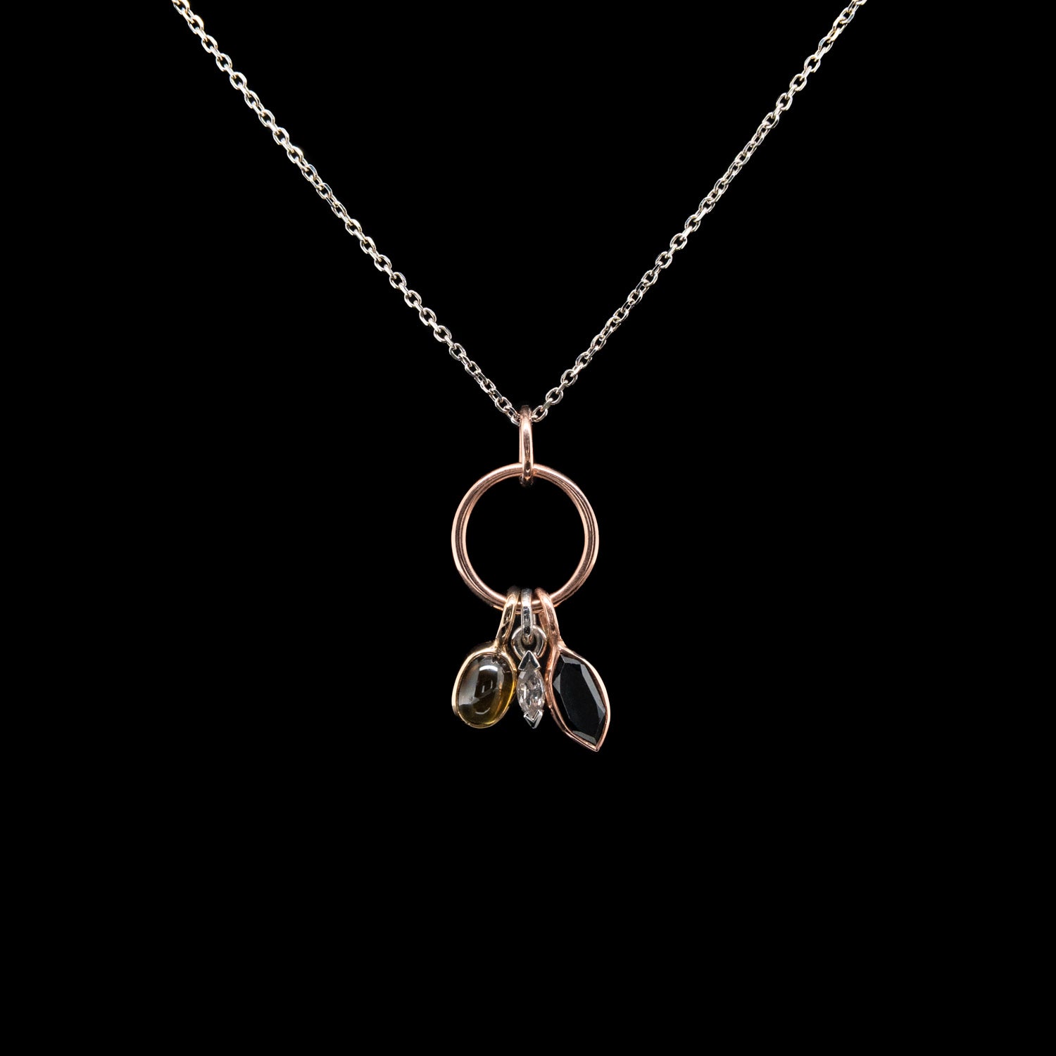 Multi-drop diamonds and sapphire pendant with 5x2mm marquise salt and pepper diamond set in half rubover setting. 6.5mm green cabochon sapphire set in 9ct yellow gold. 8mm black sapphire marquise set in 9ct rose gold. Set on 9ct rose gold jump ring on 18" platinum chain (Total Weight 4.2g including chain). Hallmarked 9ct and platinum.
