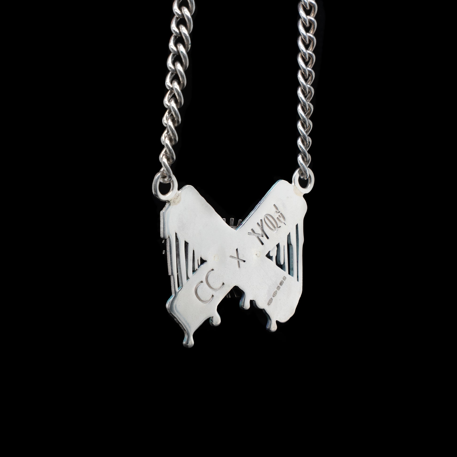 Reflections Of You Silver spray painted one-of-a-kind necklace. Silver ‘X’ with teal into dark blue spray painted by My Dog Sighs. Silver eye riveted to ‘X’ with black rhodium plated lashes, pupil and outer iris. Fixed on an antique silver curb chain. Charlotte Cornelius registered makers mark and full Hallmark on reverse. Cross measures: 44mm x 40mm. 49.5g.