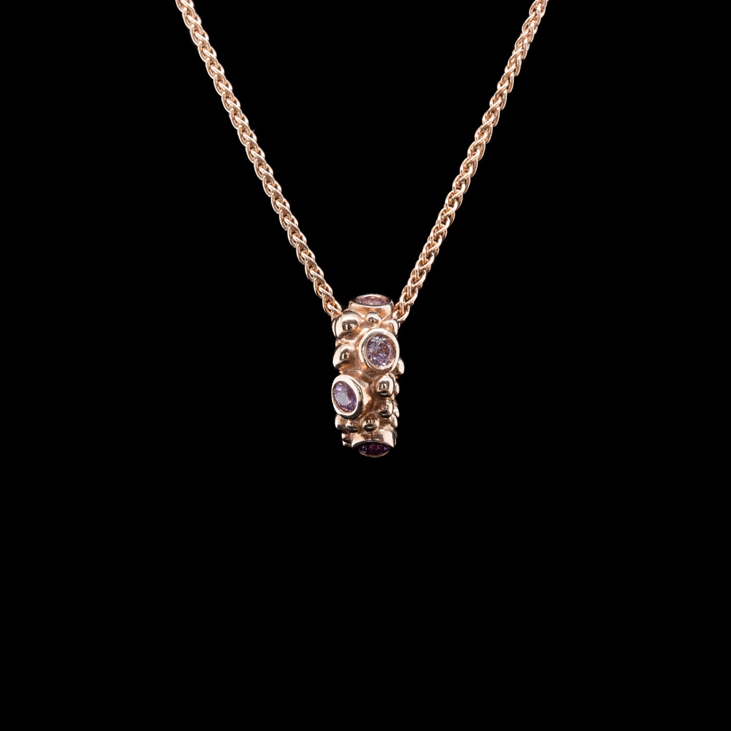 9ct gose gold bubble link pendant rubover set with pink sapphires. Including 16 inch 9ct spiga chain.