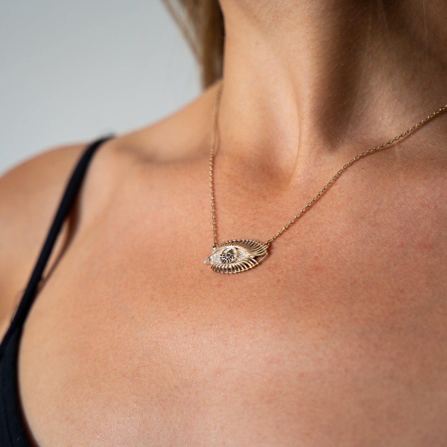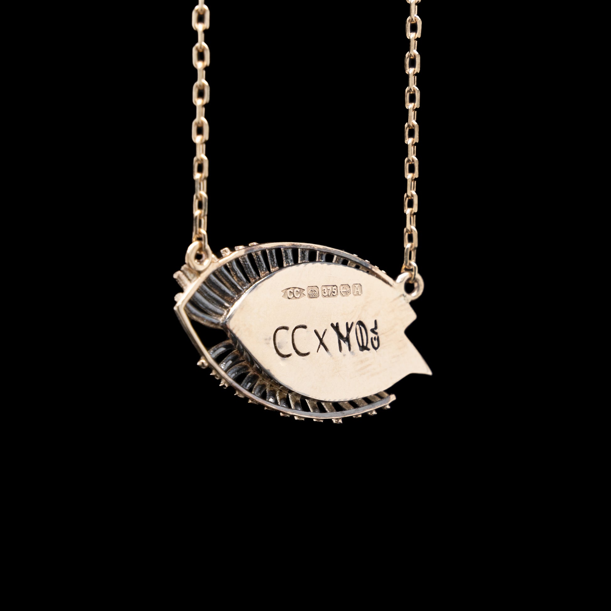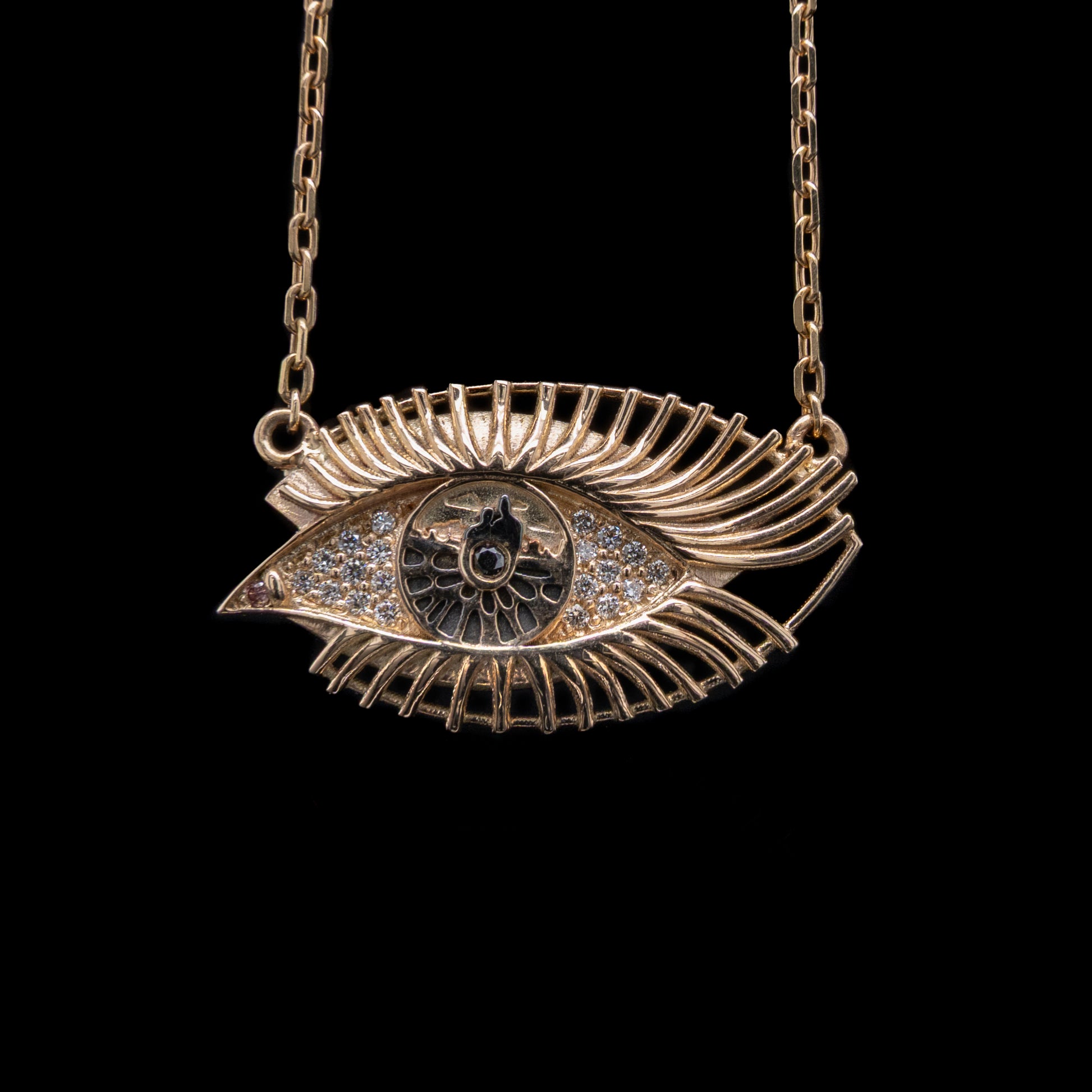 Discover the Sparkle in your eyes necklace. Limited edition collaboration between award winning jewellery designer Charlotte Cornelius and internationally acclaimed street artist My Dog Sighs. Made from solid 9ct gold, the eye-shaped pendant is pavé set with shimmering 1mm white diamonds across the cornea, a 1.2mm pink diamond in the tear duct, and a 1.5mm black diamond in the pupil. Suspended from a fine gold chain.
