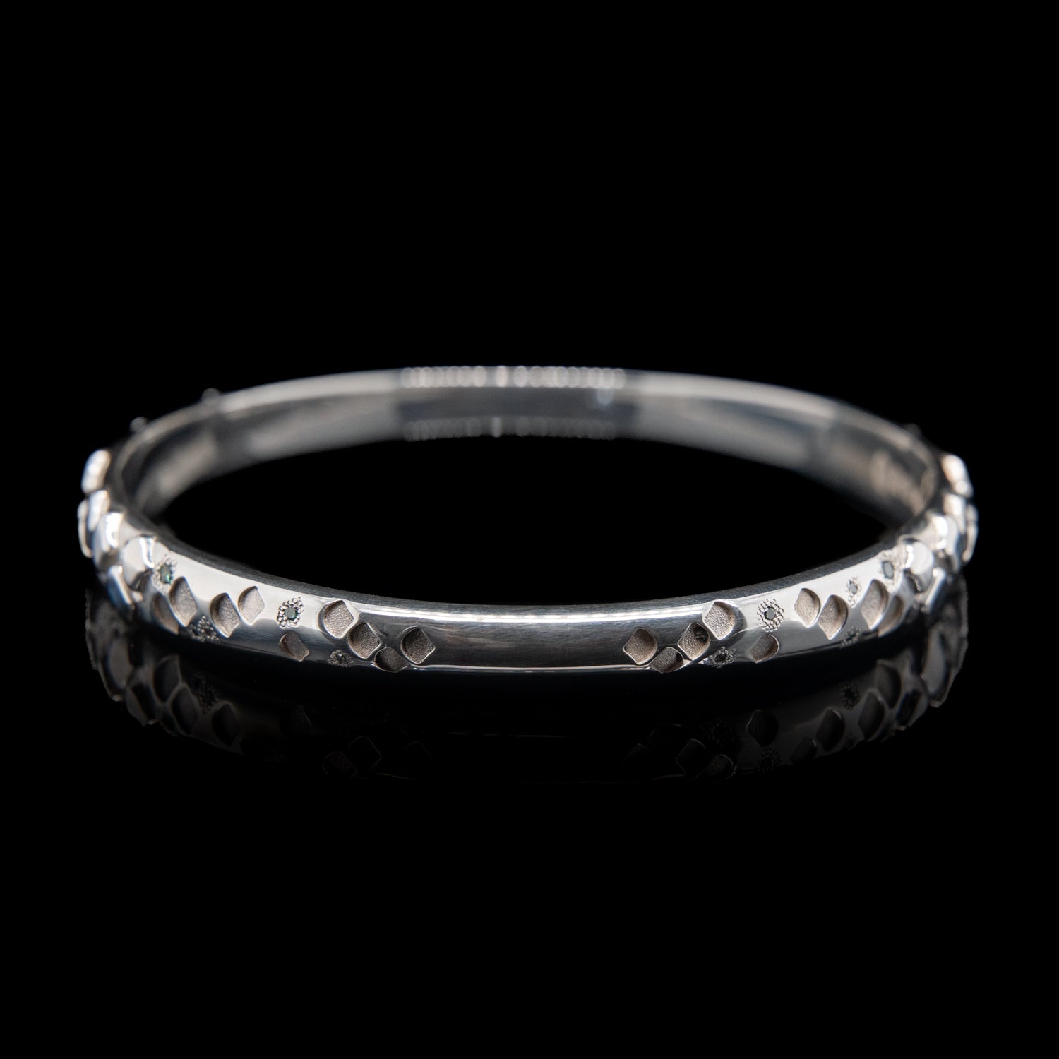 Wavy silver scale bangle. Grain set with nine, 1.65 mm round brilliant cut seagreen diamonds and thirteen 1mm blue diamonds, fourteen, 1mm S&P diamonds. With a carat total of 0.29cts and seventeen x 2mm round Fairtrade teal sapphires with a carat total of 0.61cts.Sapphires origin Sri Lanka . Large feature hallmark.